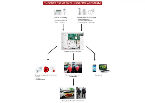 Приемно-контрольный прибор получает сигнал, и в соответствии с программой охраны, передает информацию на исполнительное устройство. Оно активируется, включает сирену или голосовое оповещение, свет и осуществляет дозвон на телефон. Сигнал может передаваться также по GSM каналу, по радиоканалу или через интернет.