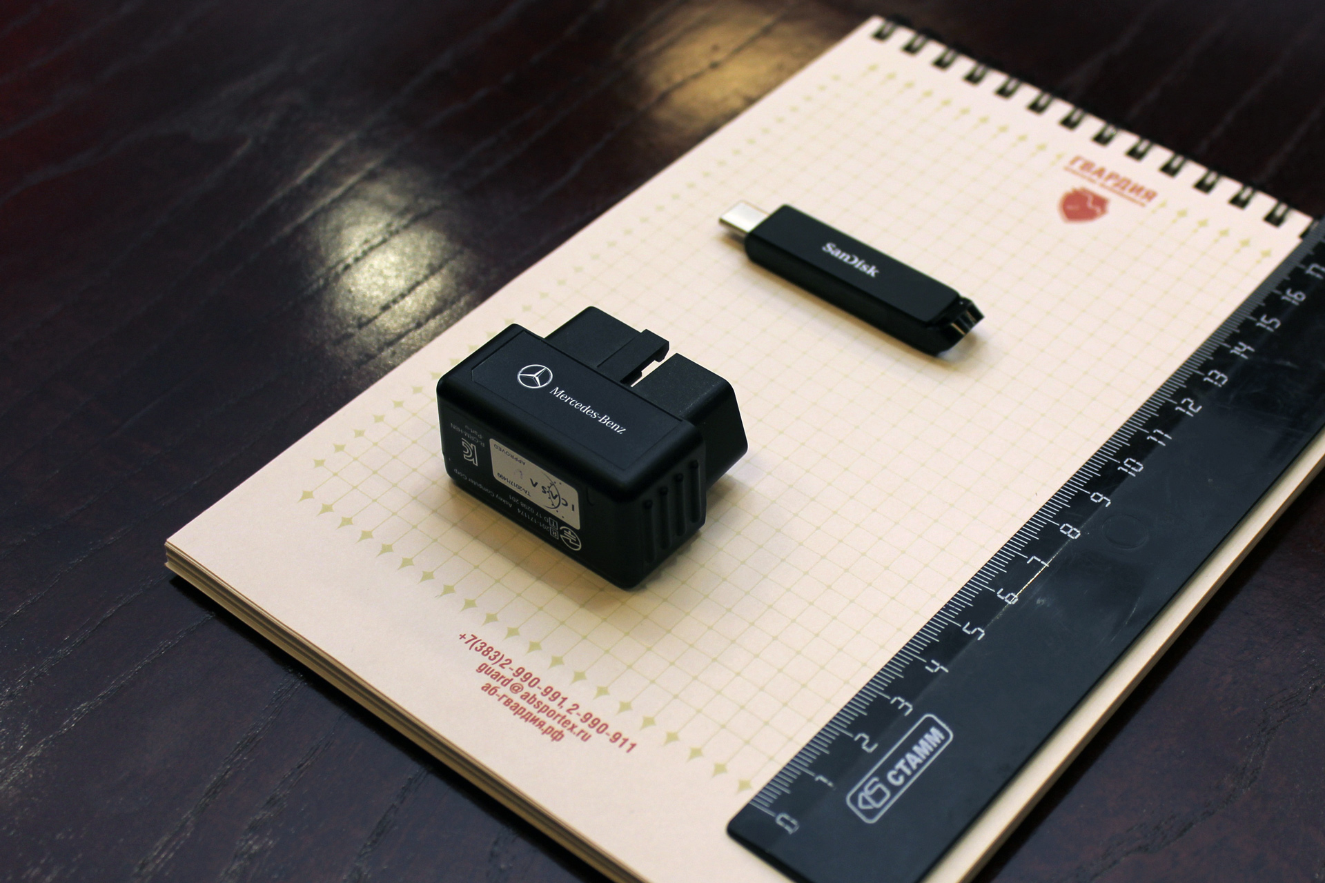 Прибывшие технические специалисты подтвердили – какой-то непонятный источник создает радиопомехи и не дает сигнализации связаться с пультом «ГВАРДИИ». Осмотр помещения ничего не дал, зато внутри самого автомобиля рядом с рычагом открытия капота специалисты обнаружили модуль Mercedes Me Adapter, вставленный в стандартный диагностический разъем OBD-2. Сам хозяин сообщил, что устройство не устанавливал и видит впервые. Получается, что его тайком мог установить только покупатель во время осмотра.